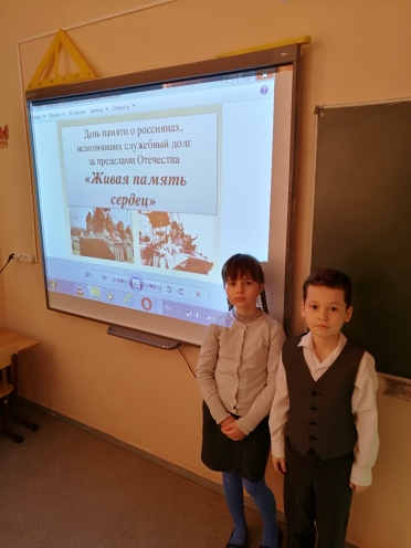 15 февраля отмечается памятная дата- «День памяти о россиянах, исполнявших служебный долг за приделами Отечества». Дата приурочена к завершению вывода советских войск из республики Афганистан. Во 2 классе МБОУ Лысогорской СОШ в честь этой даты прошел урок Мужества, посвященный землякам, исполняющим служебный долг за пределами Отечества.