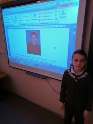 На уроке ребята познакомились с героическими и трагическими страницами истории Отечества. Узнали о мужестве, чести, долге, ответственности своих земляков – Юрия Кушнарева, погибшего в Афганистане и Александра Кузнецова, получившего ранение в Дагестане, и впоследствии умершего от ранения в госпитале. Так же ребята разместили благодарность Кузнецову Александру на сайте Спасибозавсё.рф.