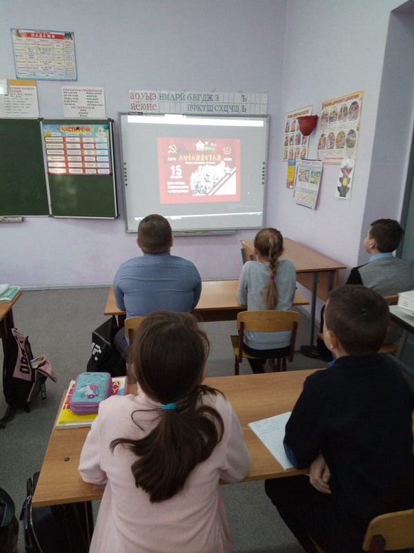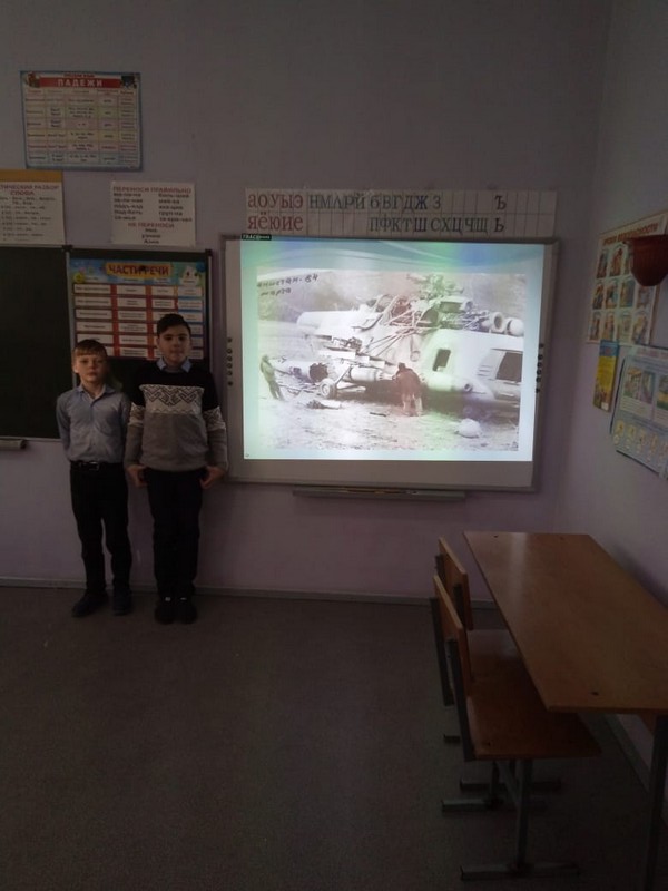 На уроке вспомнили о земляке, воине-афганце Кушнареве Юрие Алексеевиче, который погиб 25 марта 1985 году в Афганистане при выполнении боевого задания. Также учащимся была показана презентация об истории военного конфликта в Афганистане, кроме того были продемонстрированы хроникальные видеоматериалы вывода советских войск из ДРА.