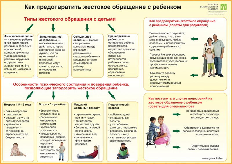 Родители, жестоко обращающиеся со своими детьми или пренебрегающие ими, встречаются в любой этнической группе, в любом классе общества и в любом географическом районе. В противовес общепринятому мнению, только 10% родителей жестоких со своими детьми, являются психическими больными. Остальные 90% — это люди, часто находящиеся в состоянии стресса, у которых личная жизнь нередко запутана и беспорядочна. Жестокое обращение с ребенком, обычно непреднамеренное, является результатом неконтролируемой ярости или плохого настроения. Большинство родителей, жестоких со своими детьми, говорят, что они чувствуют себя виноватыми после того, как причинят боль своему ребенку или обидят его. Жестокое обращение с ребенком может быть следствием чрезмерной реакции на стрессовую ситуацию, включающую в себя тяжелые условия жизни, кратковременные или долговременные финансовые затруднения, а также отсутствие необходимой информации о воспитании ребенка и родительского опыта. Подавляющее большинство родителей, обижающих своих детей, хотели бы быть хорошими родителями. Однако во время кризиса они стремятся вести себя так же, как вели себя их собственные родители: большинство людей, жестоко обращающихся со своими детьми, в детстве сами страдали от жестокого обращения. Большинство родителей, проявляющих физическую жестокость по отношению к своим детям, считают, что быть родителем — значит держать детей в строгости. Они откликаются на плохое поведение своего ребенка единственным известным им видом наказания — физическим насилием.