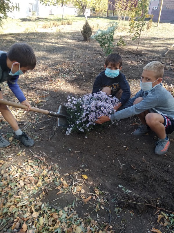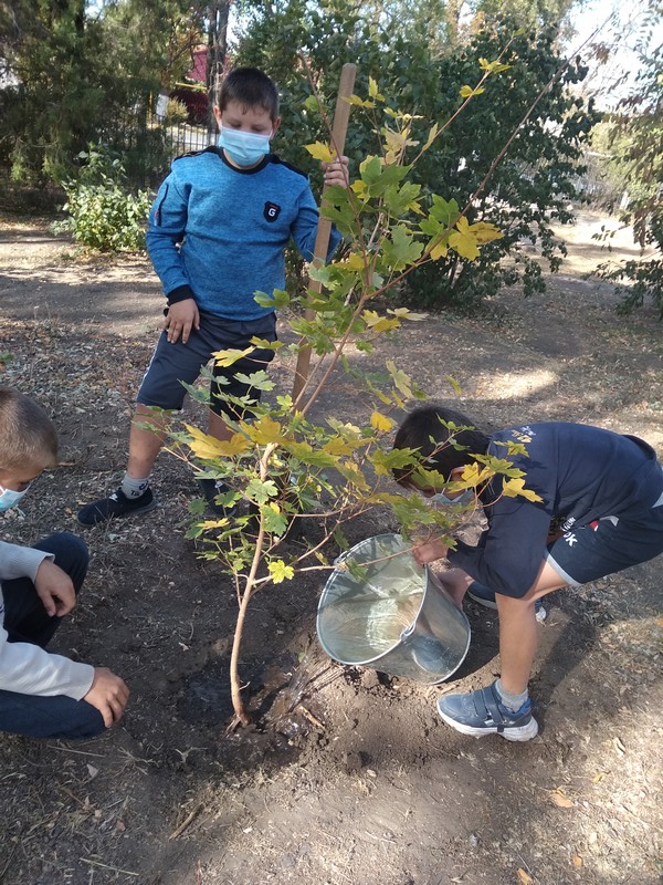 Учащиеся начальных классов посадили в школьном дворе деревья, цветы и кустарники. 3 класс принял активное участие в посадке деревьев: ребята принесли саженцы, подготовили места для посадки, полили вновь посаженные деревца и кустарники.