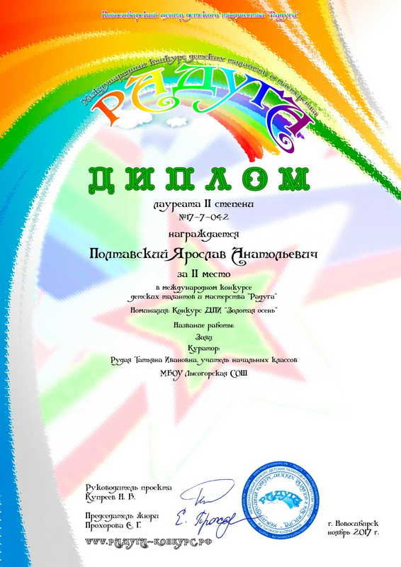 Полтавский Ярослав, ученик 3 класса, принял участие и занял II место в международном конкурсе детских талантов и мастерства «Радуга»
