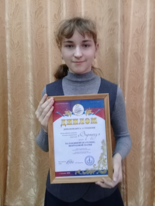 Дуэт Баландина Екатерина и Шорохова Мария стали победителями Всероссийского конкурса «Виртуоз», где получили Диплом 1-ой степени. Молодцы Катя и Маша! Поздравляем!