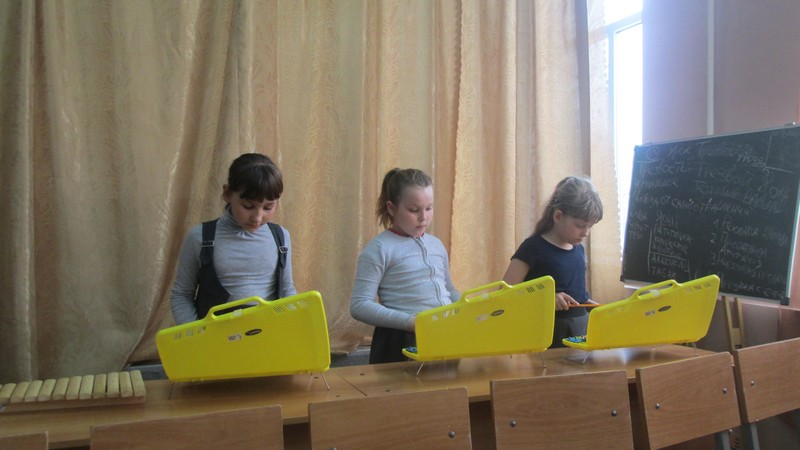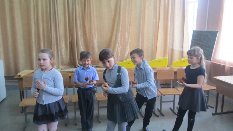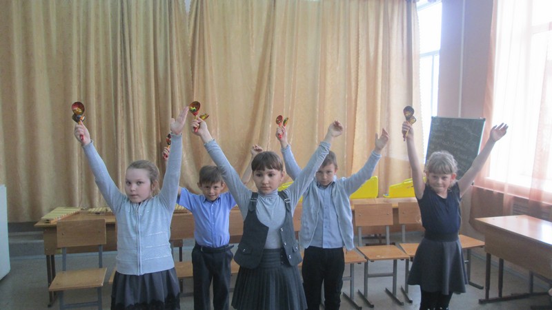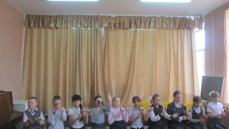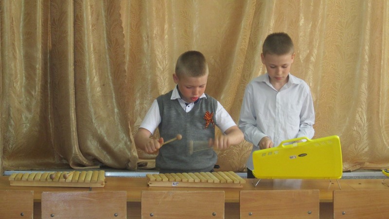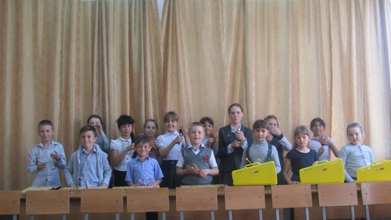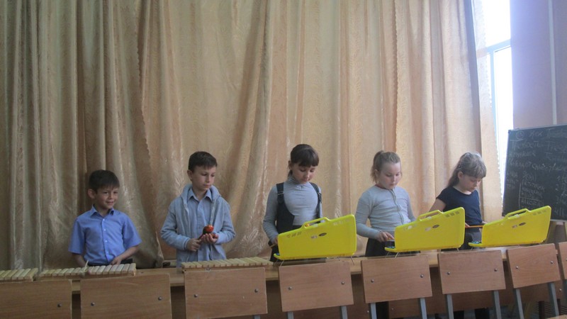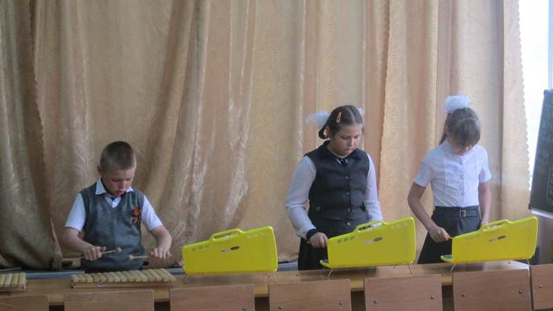 Учащиеся школы 1- 6 классов, посещающие внеурочные занятия шумового оркестра, выступили на отчетном концерте. Ребята 1-2 классов исполнили на металлофонах, ксилофонах, треугольниках народные песни «Два веселых гуся», «Я на горку шла», «Во поле береза стояла», и танец с ложками «Блины».