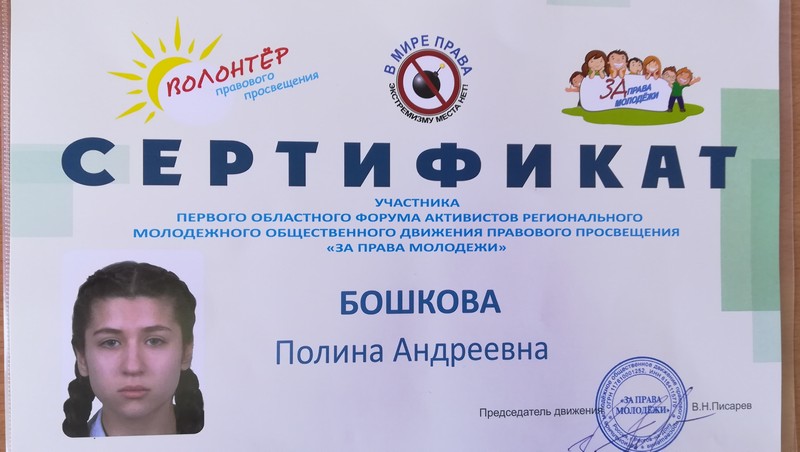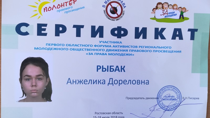 15 июля в ДОЦ "Орленок" в Неклиновском районе состоялось торжественное открытие Первого областного форума активистов Регионального молодежного общественного движения правового просвещения "ЗА ПРАВА МОЛОДЕЖИ", в котором активное участие приняли учащиеся нашей школы Бошкова Полина и Рыбак Анжелика.