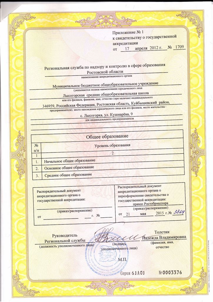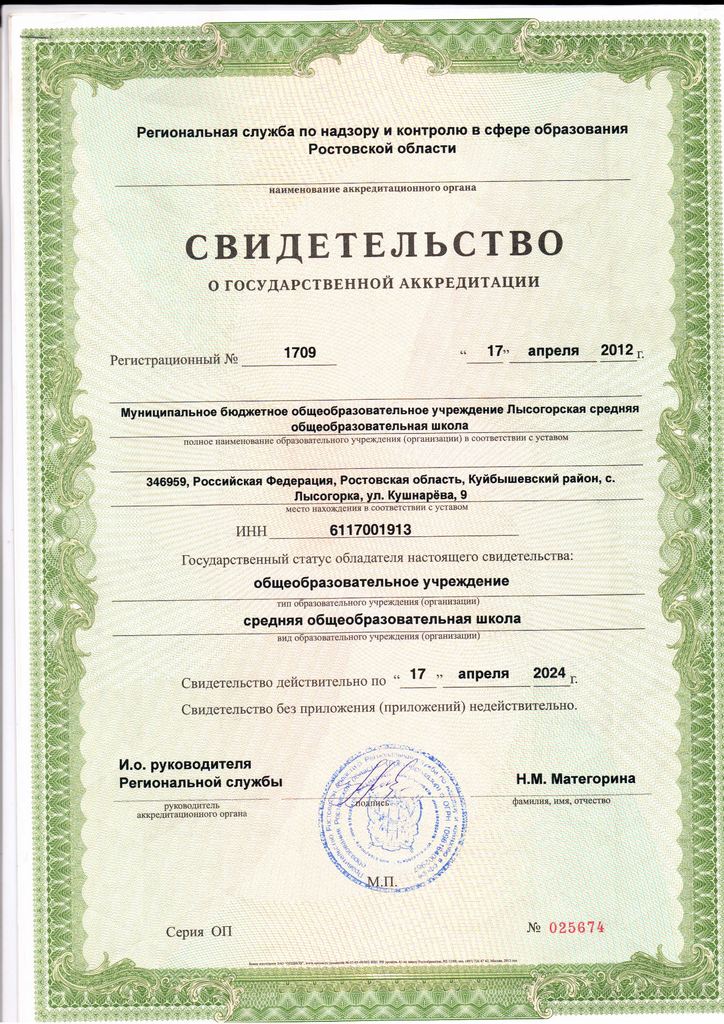 Муниципальное бюджетное общеобразовательное учреждение Лысогорская средняя общеобразовательная школа. 346959, Российская Федерация, Ростовская область, Куйбышевский район, с. Лысогорка, ул. Кушнарёва, 9. ИНН 6117001913. Государственный статус обладателя настоящего свидетельства: общеобразовательное учреждение средняя общеобразовательная школа.