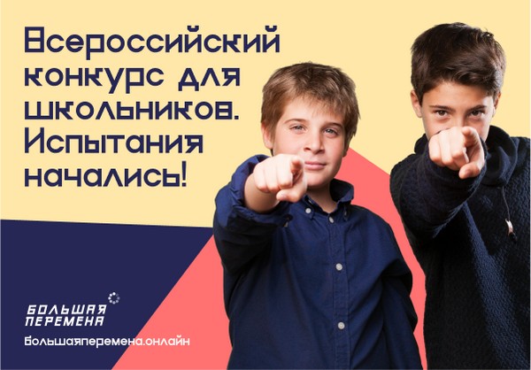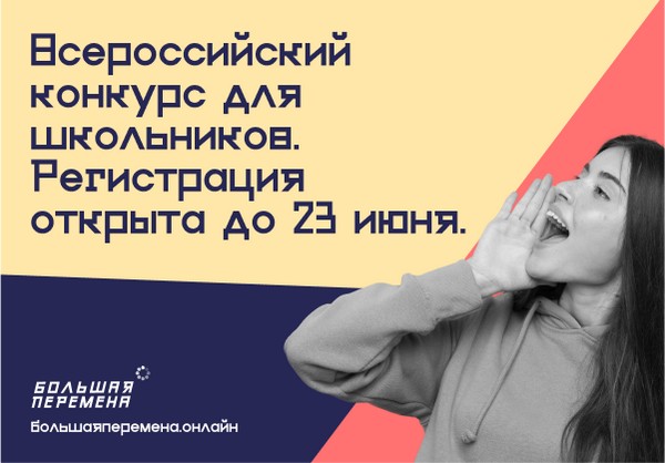 Всероссийский конкурс «Большая перемена» - это онлайн-платформа для образования, развития и коммуникации всех учеников 8-10 классов. Конкурс стартовал 28 марта и пройдет до октября 2020 года. Регистрация участников открыта на сайте БольшаяПеремена.онлайн до 23 июня.
