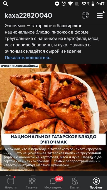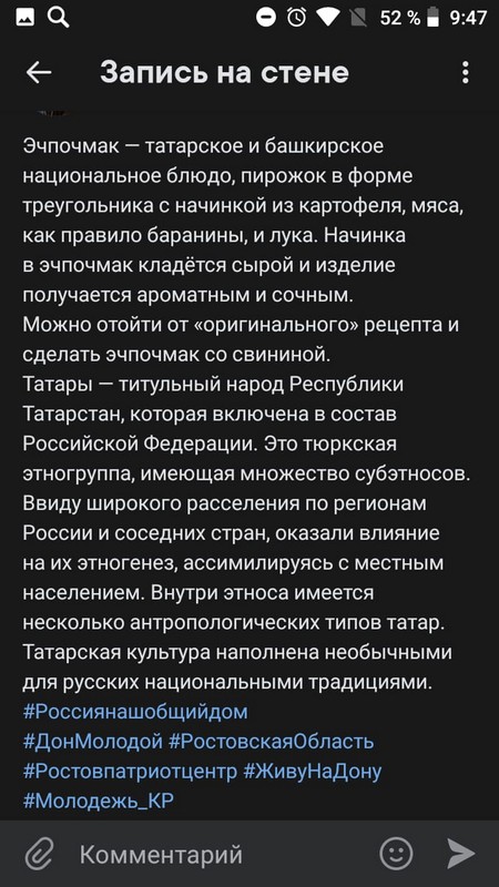 10 класс представил происхождение татарского и башкирского блюда «Эчпочмак». Опубликован пост в социальной сети ВК, который содержит изображение и информационное сообщение в виде познавательных фактов о культуре и традициях народов России. Запись опубликована в социальных сетях с хештегами #Россиянашобщийдом #ДонМолодой #РостовскаяОбласть #Ростовпатриотцентр #ЖивуНаДону #Молодежь_КР.