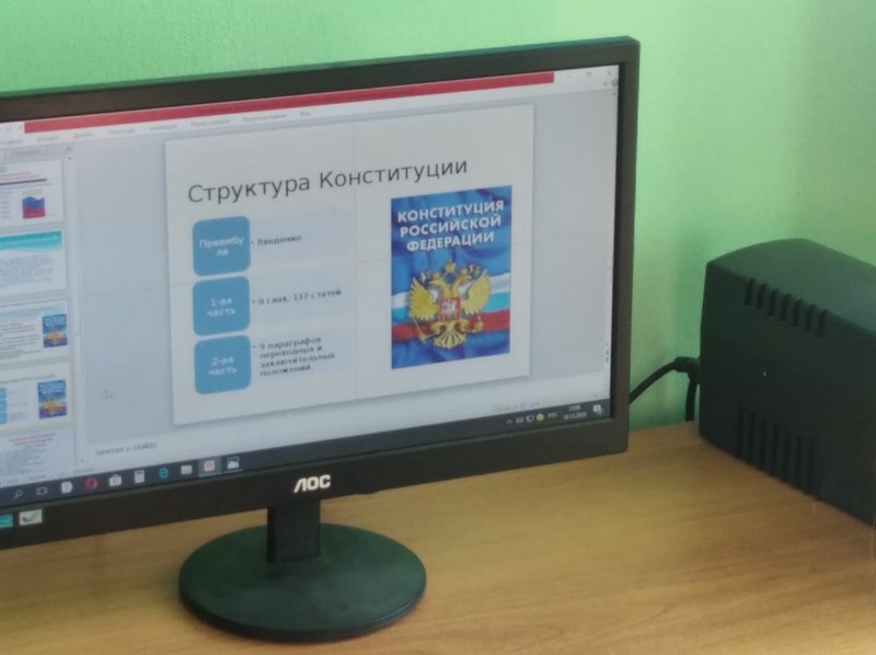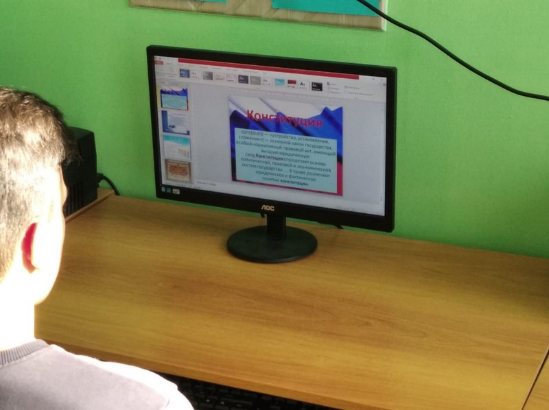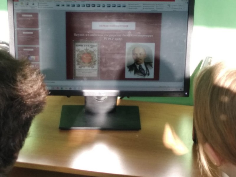 В 9 классе Светличной М.И. был проведён парламентский урок «Конституция РФ» в сопровождении компьютерной презентации. Цель урока: сформировать представление учащихся о первых попытках введения конституционного правления в России и начале демократического конституционализма.