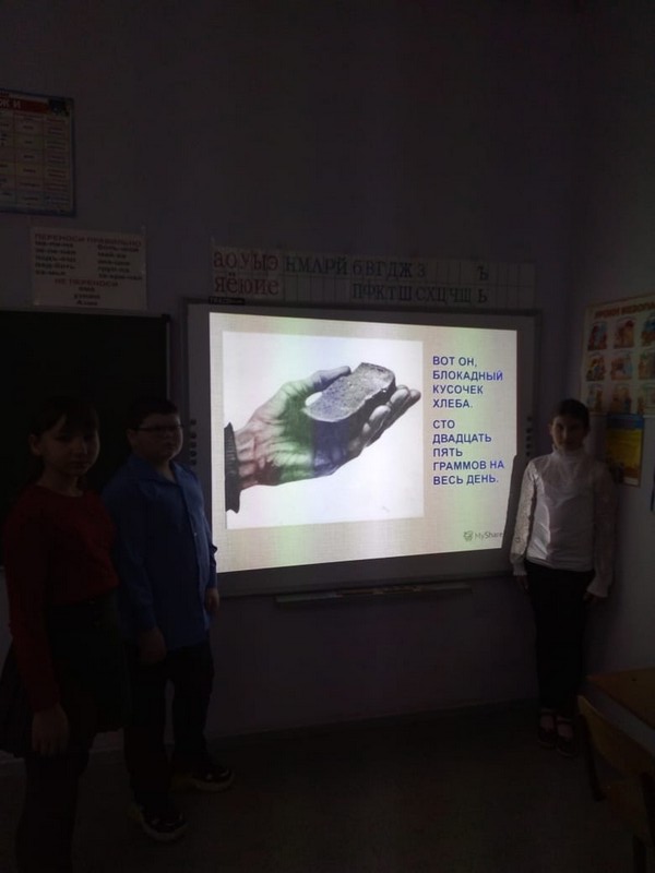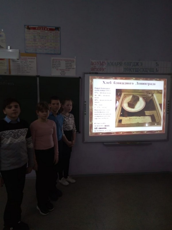Цель акции: расширить представления детей о героическом подвиге жителей Ленинграда; формировать чувство патриотизма и умение сопереживать. На классных часах были просмотрены видеоролики, которые напомнили о тех страшных событиях: о жизни блокадников, о детях войны, о ценности хлеба.