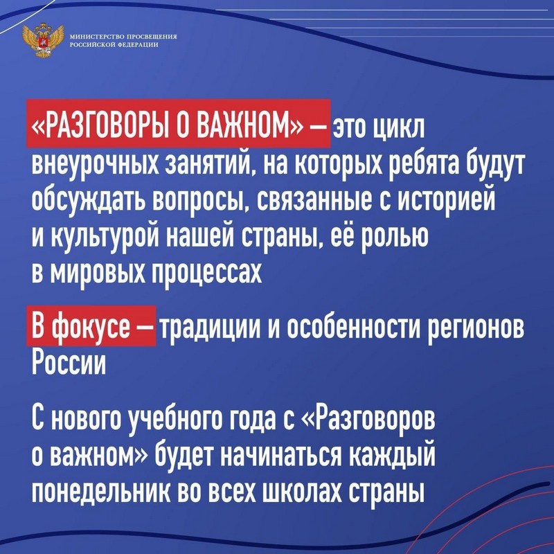 Темами бесед станут простые человеческие ценности - дружба, уважение к труду, сохранение исторической памяти, милосердие и справедливость. Или, как отметил министр просвещения Сергей Кравцов в интервью для ТАСС, события, люди, их деяния и идеи.