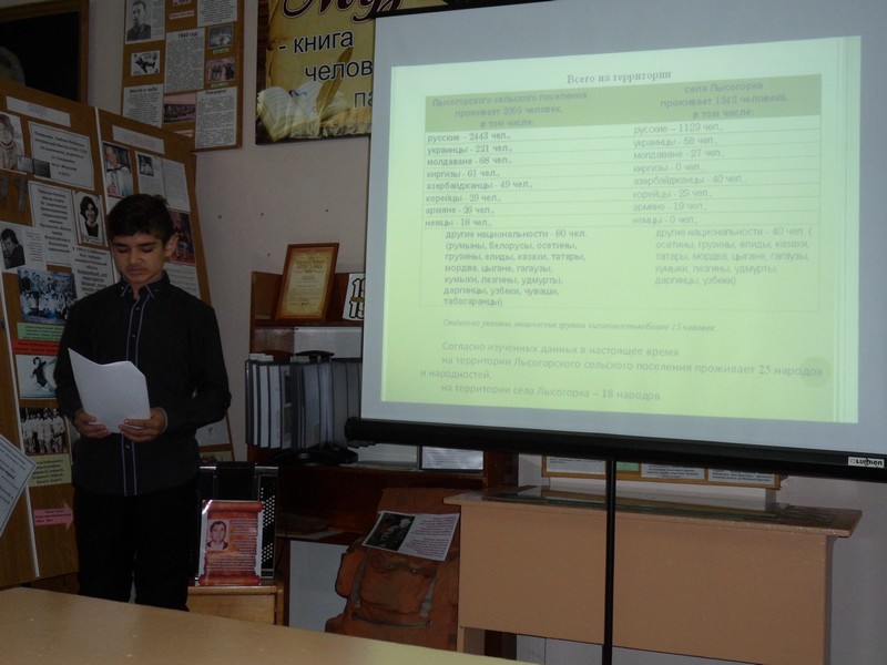 Участие в конференции приняли учащиеся нашей школы: Рыбак Анжелика (9 класс) выступила с работой «Воины освободители» в номинации «Великая Отечественная» и Пильгаев Владислав (9 класс) представил работу «Национальный состав села Лысогорка и Лысогорского сельского поселения Куйбышевского района Ростовской области» в номинации «Этнография». Защита работ сопровождалась показом подготовленных ребятами презентаций.