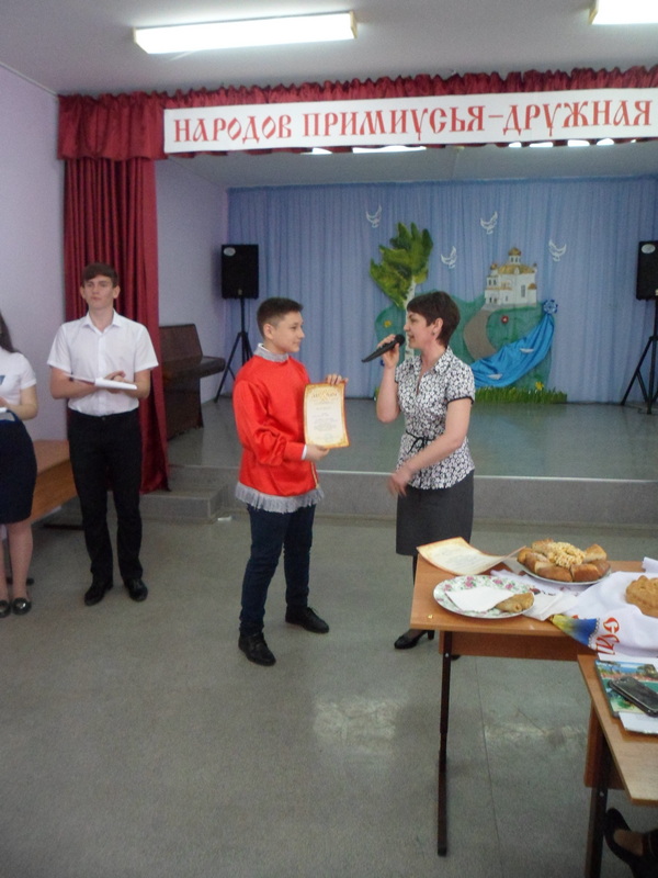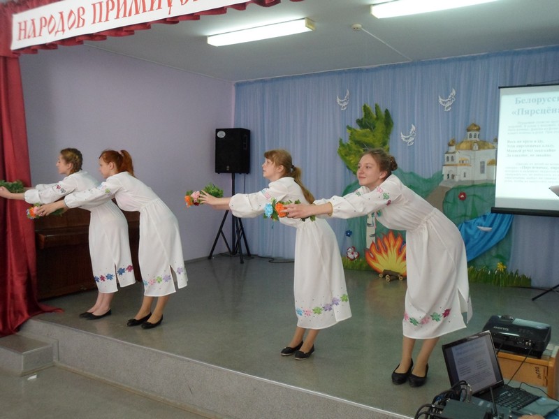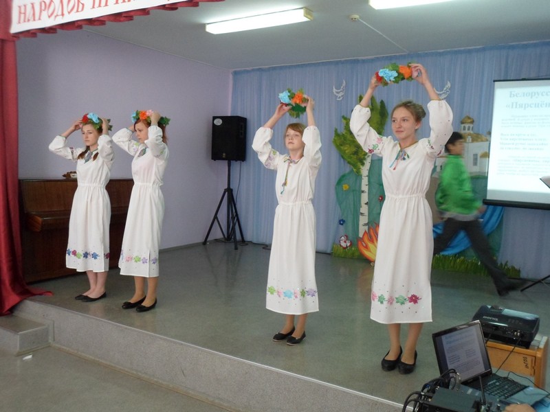 Учащиеся нашей школы представляли культуру Белорусского народа. Ребята подготовили фрагмент национального белорусского танца «Лявониха», художественную постанову весеннего праздника «Купалье», белорусскую народную игру «Пярсценак» (колечко), приготовили белорусские дранники и свой вариант символа фестиваля дружбы народов. С большим интересом приняли участие в конкурсах, подготовленных другими командами.