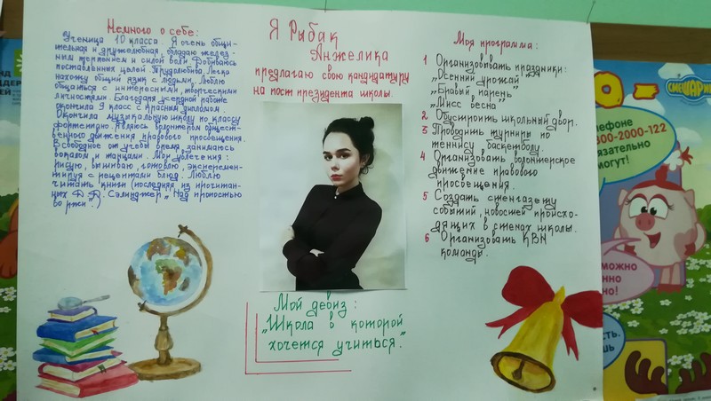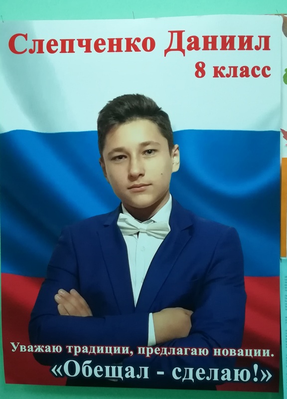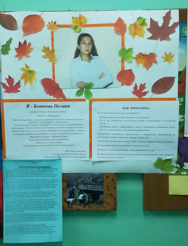 В Избирательной комиссии зарегистрировались 4 кандидата: Бошкова Полина 10 класс, Рыбак Анжелика 10 класс, Ивахненко Анастасия 9 класс, Слепченко Даниил 8 класс. Все ребята достойны возглавлять ученическое самоуправление, имеют большое желание сделать школу лучше.