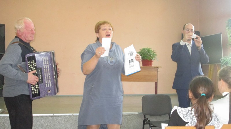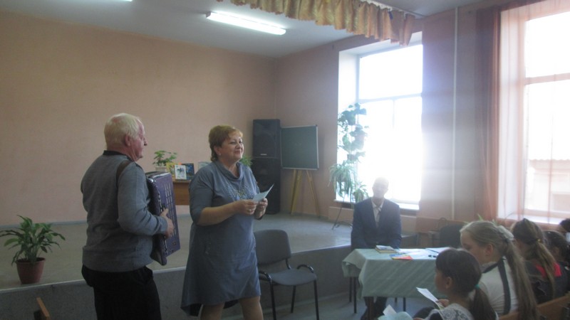 На встречу с учащимися приехали: заведующая детским отделом районной библиотеки, поэт и композитор, автор герба и флага Куйбышевского района - Ольга Викторовна Коваль, библиотекарь-краевед, поэт, победитель районного конкурса работников культуры в номинации «В ногу со временем» Максим Михайлович Соломощук и баянист, солист клубной системы Куйбышевского сельского поселения - Николай Николаевич Ветров.
