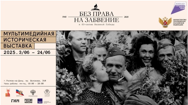 3 июня 2025 года в Центре исторического парка «Россия — моя история» откроется новая масштабная экспозиция, посвященная 80-летию Великой Победы, — «Без права на забвение». Эта уникальная мультимедийная выставка, созданная командой партнеров на основе музейных и архивных материалов, представляет собой адаптацию центрального выставочного проекта страны, представленного в Государственном историческом музее по поручению Президента РФ В.В. Путина.