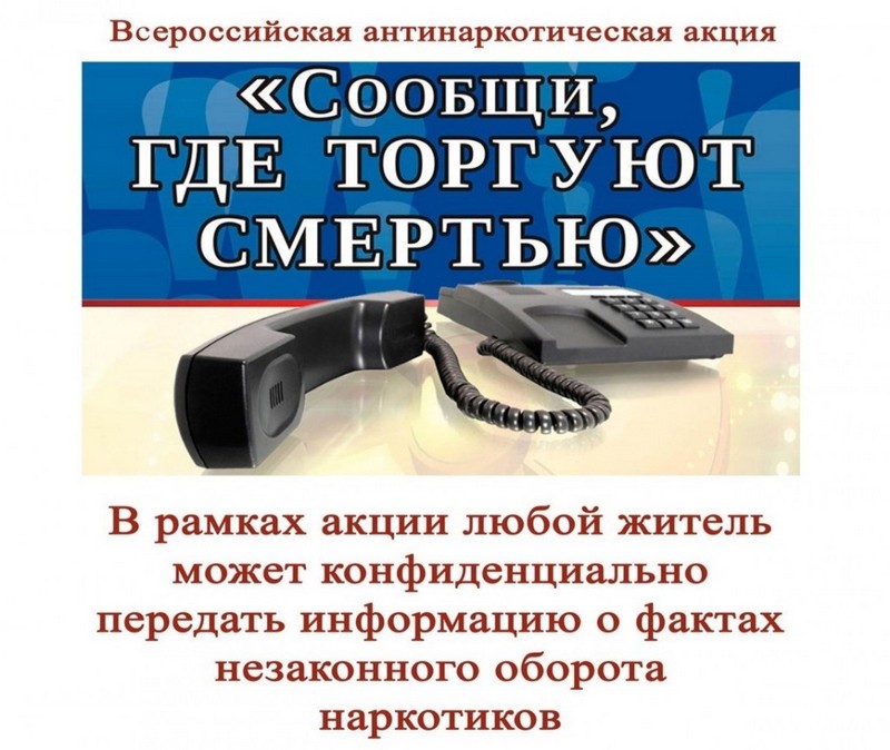 МВД России совместно с органами исполнительной власти субъектов Российской Федерации и органами местного самоуправления с 13 по 24 марта проводит первый этап общероссийской антинаркотической акции «Сообщи, где торгуют смертью».